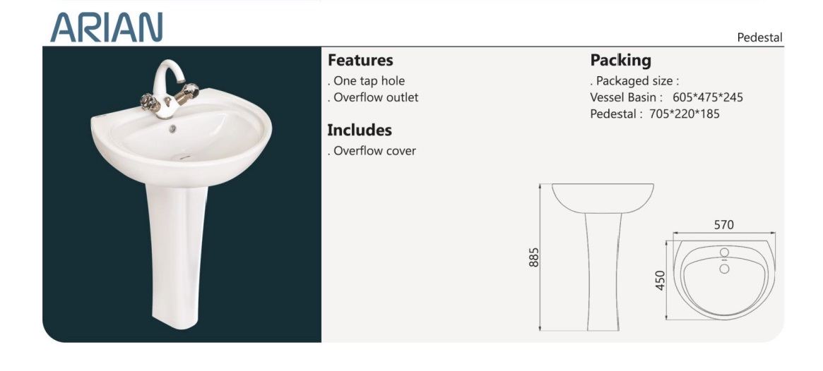 روشویی پایه دار چینی کرد مدل ارین سایز 57 (درجه 1)